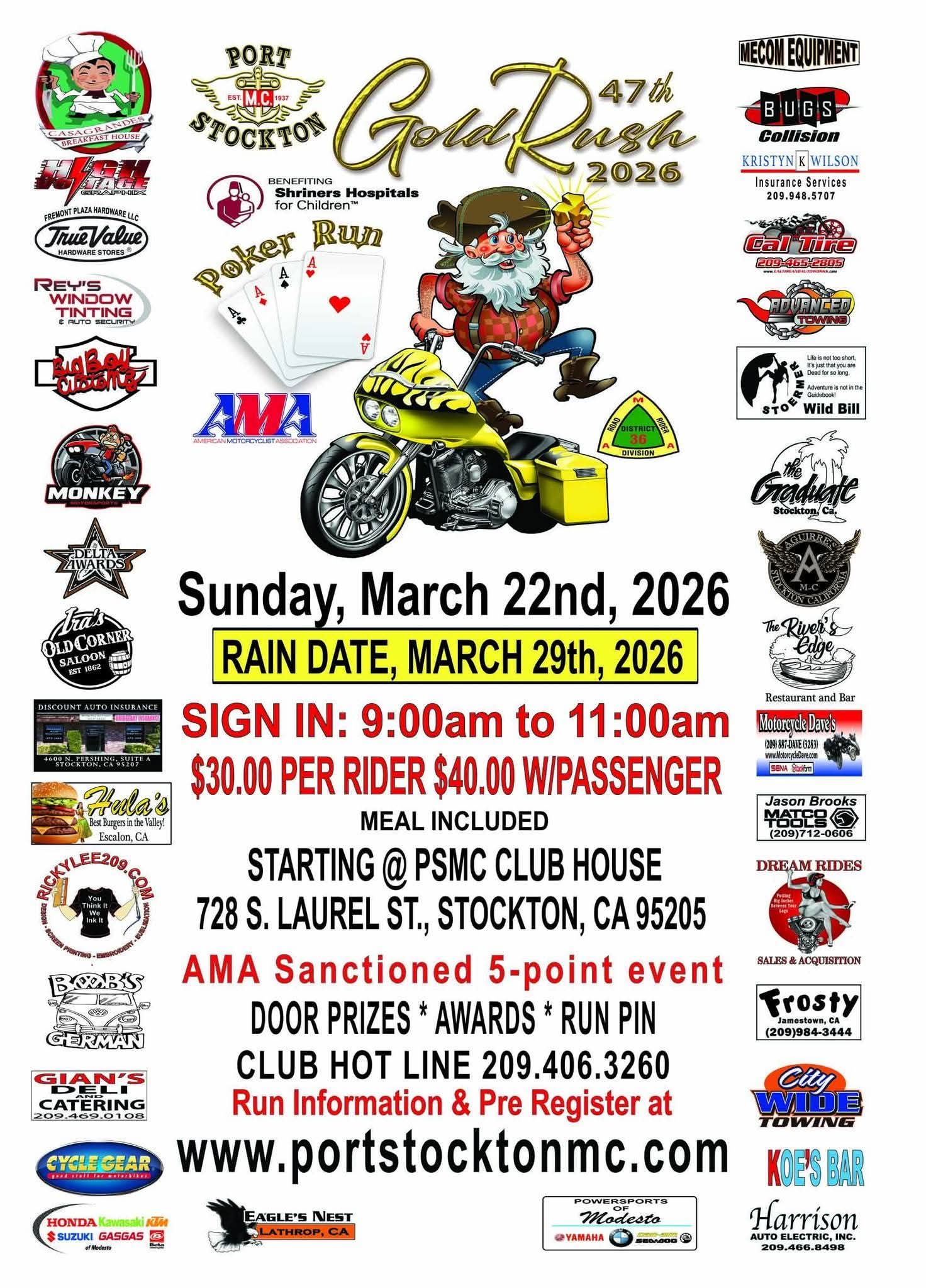 Sunday March 22nd, 2026 Sign in 9:00AM to 11:00AM 30.00 per rider - 40.00 with passenger Meal Included Starting at PSMC Club House 728 S Laurel St Stockton, CA 95205 AMA Sanctions 5-point event Door Prizes - Awards - Run Pins Club Hot Line (209) 406-3260