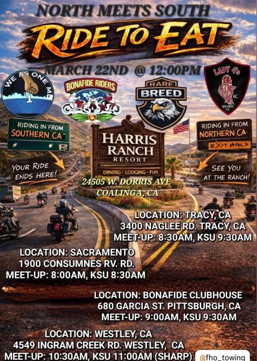 Heading to Harris Ranch 24505 W Dorris Ave Coalinga, CA 93210 Multiple Location Starting Points 3400 Naglee Rd Tracy, CA 8:00AM 1900 Consumnes Rv Rd Sacramento, CA 8:00AM 680 Garcia St Pittsburgh, CA 9:00AM 4549 Ingram Creek Rd Westley, CA 10:30AM KSU 30 minutes after meet time