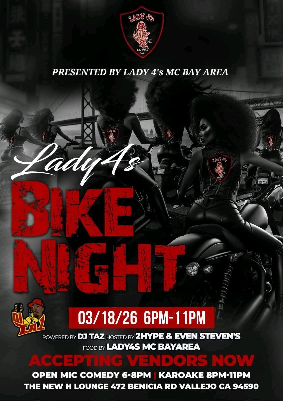 Lady 4's BIKE NIGHT 03/18/26 6PM-11PM POWERED BY DJ TAZ HOSTED BY 2HYPE & EVEN STEVEN'S FOOD BY LADY4S MC BAYAREA ACCEPTING VENDORS NOW OPEN MIC COMEDY 6-8PM KAROAKE 8PM-11PM THE NEW H LOUNGE 472 BENICIA RD VALLEJO CA 94590