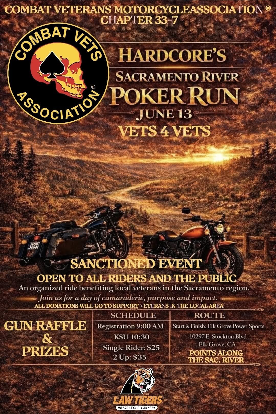COMBAT VETERANS MOTORCYCLE ASSOCIATION CHAPTER 33-7 NET HARDCORE'S ASSOCIATION SACRAMENTO RIVER POKER RUN JUNE 13 VETS 4 VETS SANCTIONED EVENT OPEN TO ALL RIDERS AND THE PUBLIC An organized ride benefiting local veterans in the Sacramento region. Join us for a day of camaraderie, purpose and impact. ALL DONATIONS WILL GO TO SUPPORT VETERANS IN THE LOCAL AREA GUN RAFFLE & PRIZES SCHEDULE Registration 9:00 AM KSU 10:30 Single Rider: $25 2 Up: $35 ROUTE Start & Finish: Elk Grove Power Sports 10297 E. Stockton Blvd Elk Grove, CA POINTS ALONG THE SAC. RIVER LAW TIGERS MOTORCYCLE LAMYERS