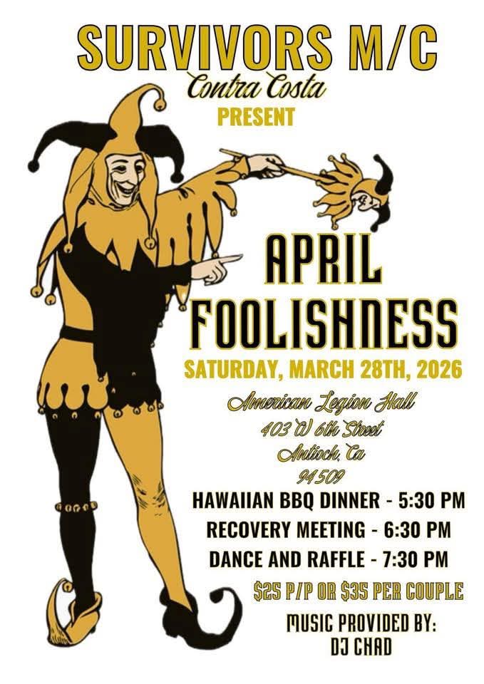 American Legion Hall 403 W 6st Antioch CA 94509 25.00 P/P or 35.00 per couple Hawaiian BBQ Dinner 5:30PM Recovery Meeting 6:30PM Dance and Raffle 7:30PM Music by DJ Chad