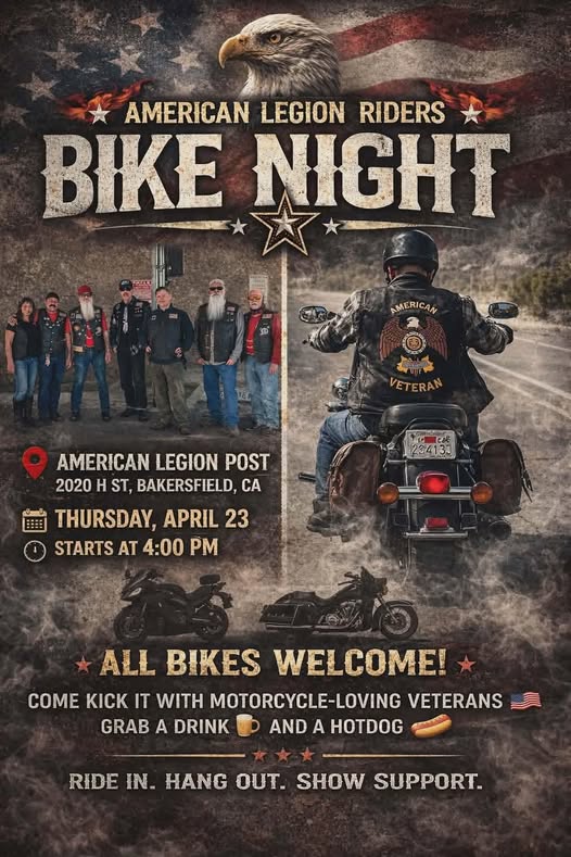 All Bike Welcomed! Come Kick It with Motorcycle Loving Veterans Grab a Drink and a Hot Dog Ride In - Hang Out - Show Support American Legion Post 2020 H St Bakersfield, CA 93301