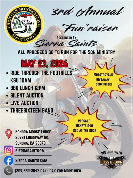 All proceeds go to Run for the Son Ministry Door Prize is a Honda Magna 750 Presale Tickets $40 At the Door $50 Ride Through the Foothills KSU 10AM BBQ Lunch 12PM Silent Auction Live Auction Threesixteen Ban Sonora Moose Lodge 20921 Longeway Rd Sonora, CA 95370 (209) 882-2843 Call Dak for More info